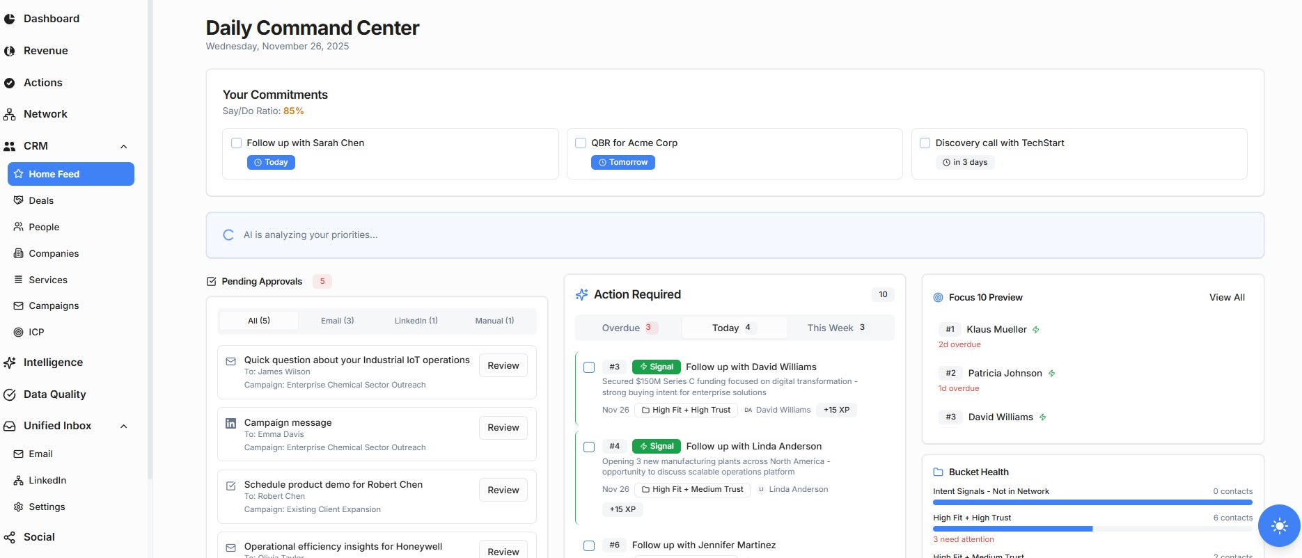 Your Say/Do ratio protects your credibility. “I feel like a fraud sometimes” becomes “My clients know I deliver what I promise.” Focus 10 surfaces the 10 people who need your attention most using timing intelligence, not random luck.