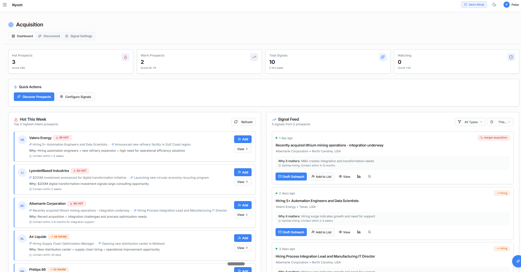 You set the triggers. The system watches while you’re earning. When someone in your High Fit bucket opens three manufacturing plants across North America, you know about it before your competitors do.