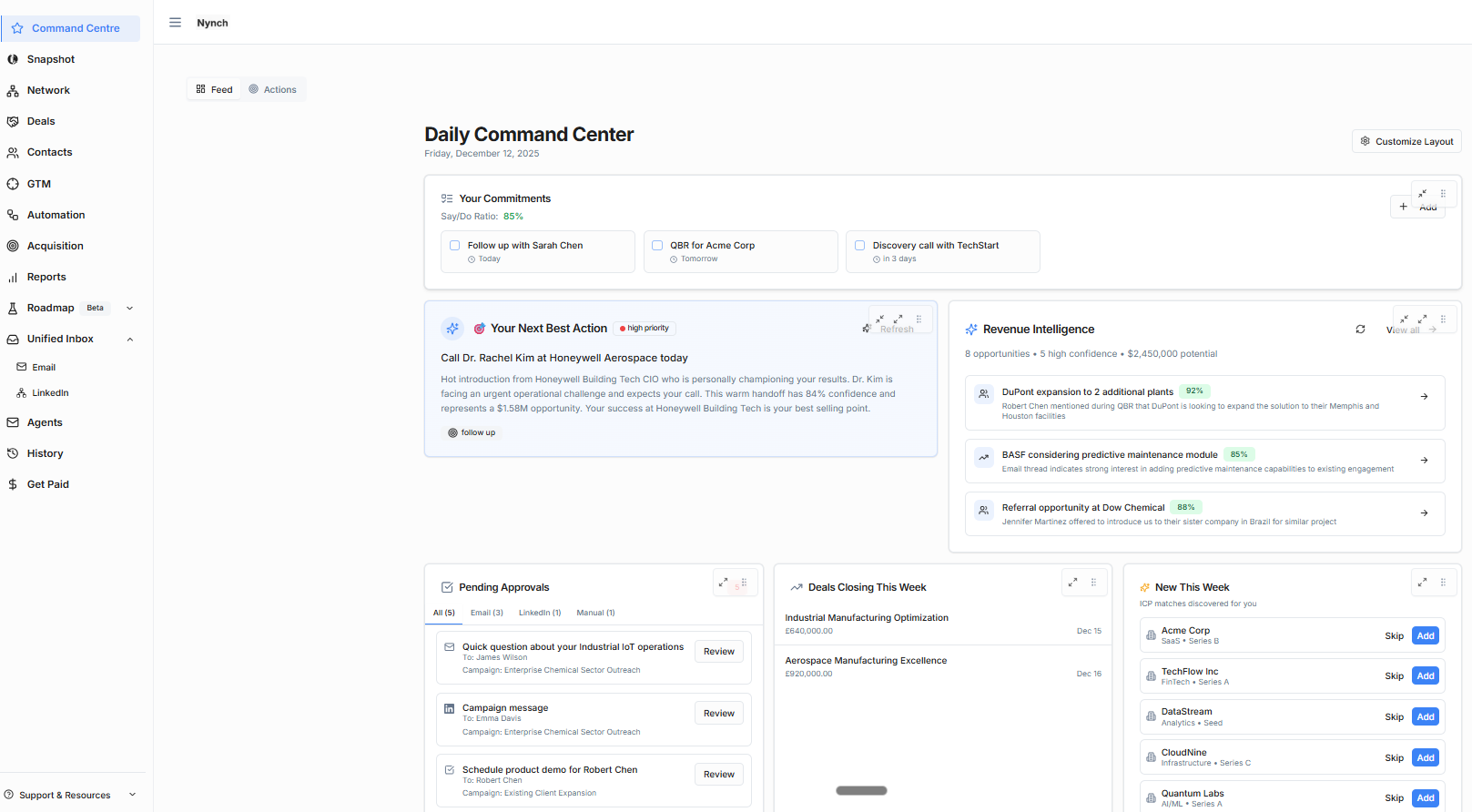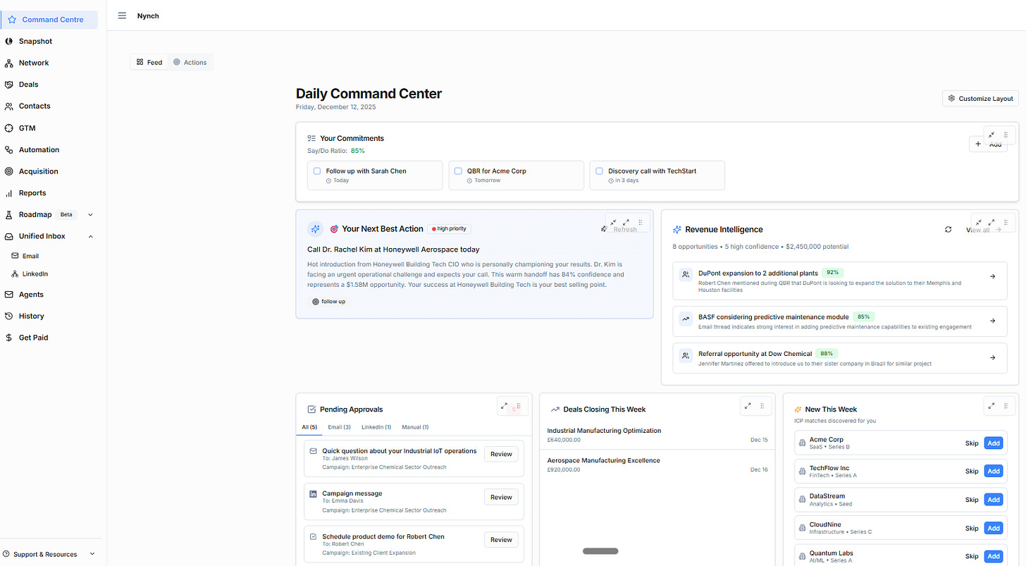 Open it. Know exactly what to do today. Commitments due. Priority contacts. AI-suggested next best actions. No more blank slate paralysis.