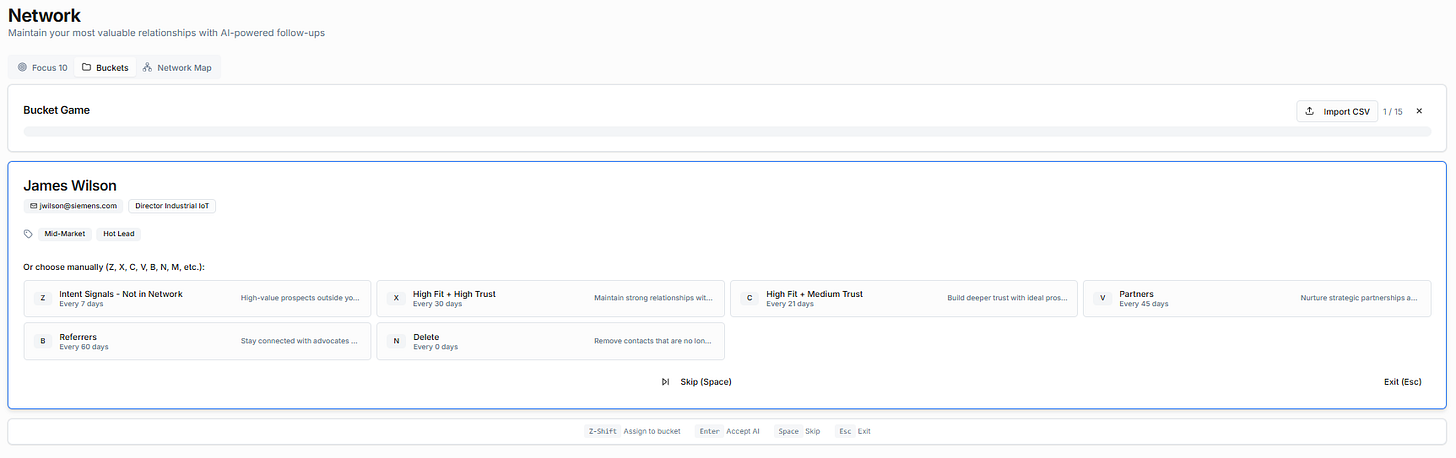 AI suggests buckets based on your ideal client profile, looking at job titles, industries, enrichment data. Keyboard shortcuts on the bottom row so you can fly through 50 contacts without lifting your hands.